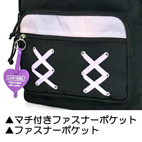 ラバー素材のハートチャームもオススメポイント!リュックを背負ったまま荷物の出し入れができる便利な背面ファスナー付き。