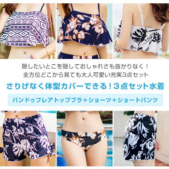 水着 体型カバー 大きいサイズ バンドゥビキニ フレア フレアトップ バンドゥ 小胸 ショートパンツ レディース ワイヤー パット 3L 4L 5L 6L 3点セット 花柄 エスニック ブラック ネイビー ホワイト 可愛い おしゃれ 通販