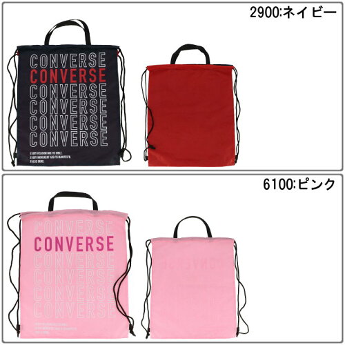 コンバース(CONVERSE)ナップサック ●素材 ・ポリエステル ●サイズ ・約48×40cm ●カラー ・1900:ブラック ・2200:サックス ・2900:ネイビー ・6100:ピンク ・6400:レッド さまざまなシーンで活躍するナップサック。